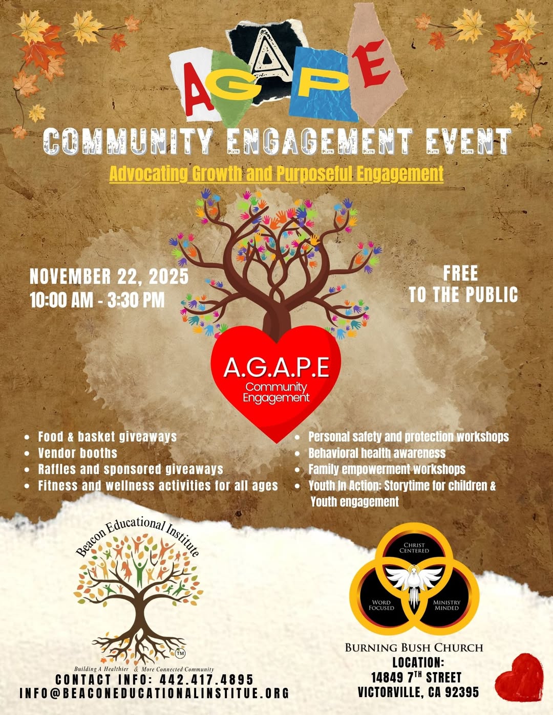 The High Desert community is invited to come together for the A.G.A.P.E. Community Engagement Event on Saturday, November 22, 2025, from 10:00 a.m. to 3:30 p.m. at Burning Bush Church, 14849 7th Street, Victorville.