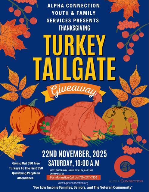 Alpha Connection Youth & Family Services invites the community to their Turkey Tailgate Giveaway on Saturday, November 22, 2025, at 10:00 a.m. Join them at 18522 Outer Highway 18, Apple Valley, as they spread holiday cheer and give out 350 free turkeys to the first 350 qualifying families, seniors, and veterans in attendance.