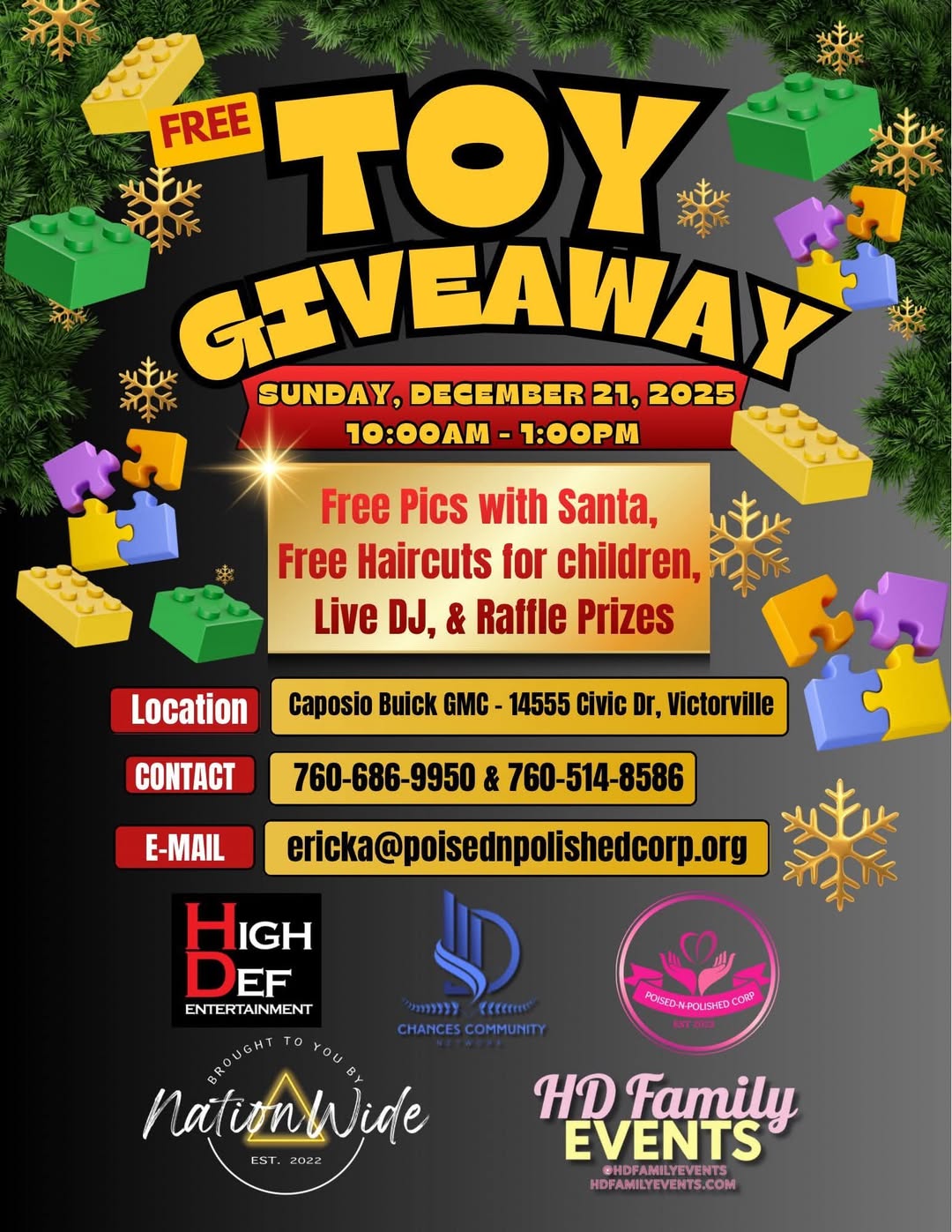 Families across the High Desert are invited to enjoy a fun and festive morning at the Free Toy Giveaway happening on Sunday, December 21, 2025, from 10:00 AM to 1:00 PM at Caposio Buick GMC in Victorville.